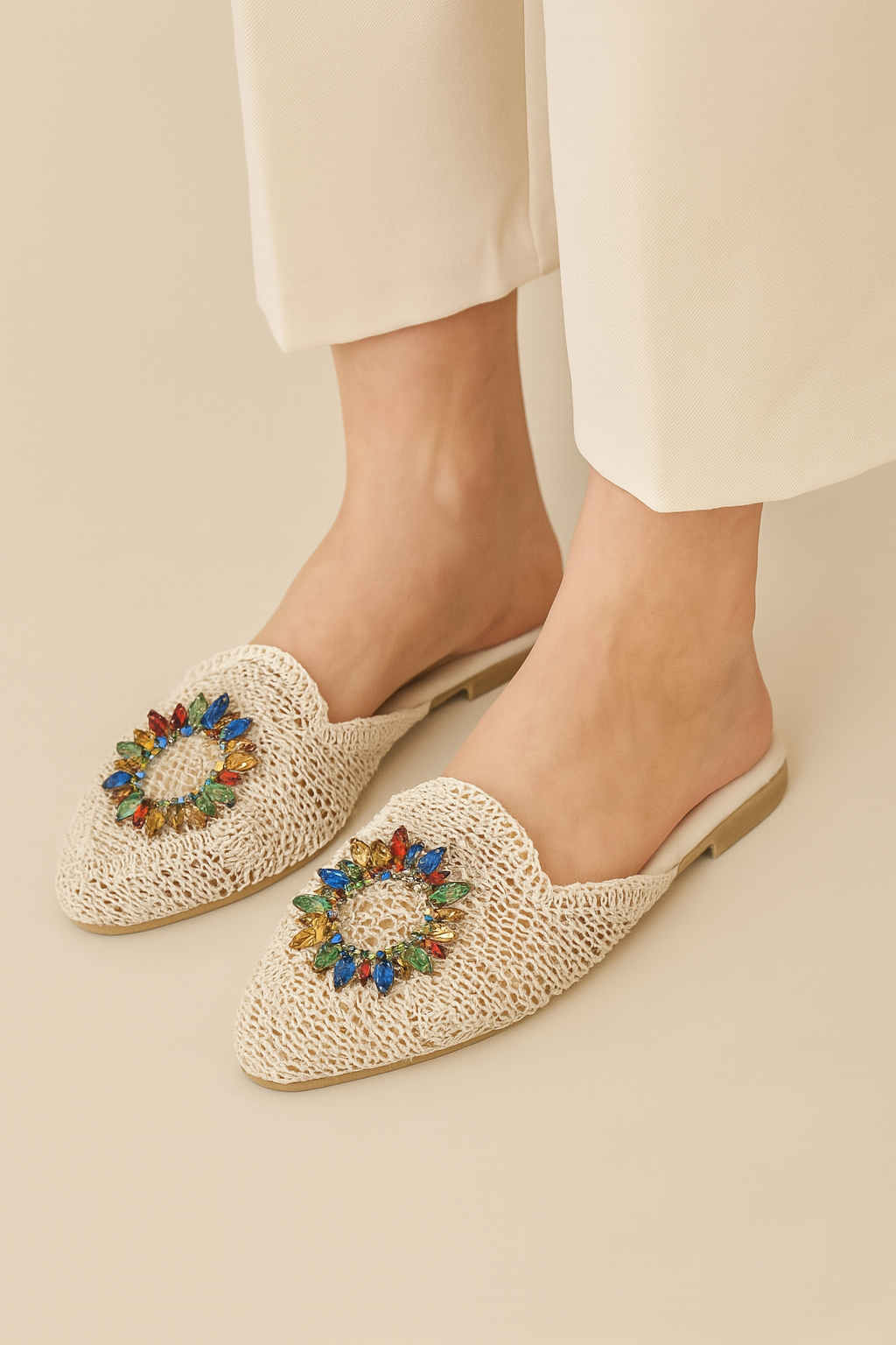 El örgüsü dokusuyla doğal bir zarafet sunan Casualine kadın terlik, renkli taş detaylarıyla göz alıcı bir şıklık yaratıyor. Krem tonlarındaki hafif yapısıyla yaz aylarında rahat bir kullanım sunan bu terlik, nefes alabilir yapısıyla gün boyu konfor sağlar. Üst kısmındaki yuvarlak taş süslemesi, her adımda ışıltı katarken; yumuşak tabanı ayak sağlığını destekler. Günlük kullanıma uygun olan model, plaj kombinlerinden şehir içi gezilere kadar geniş bir kullanım alanı sunar. Hem rahatlığı hem de şıklığı bir arada arayan kadınlar için mükemmel bir tercih.