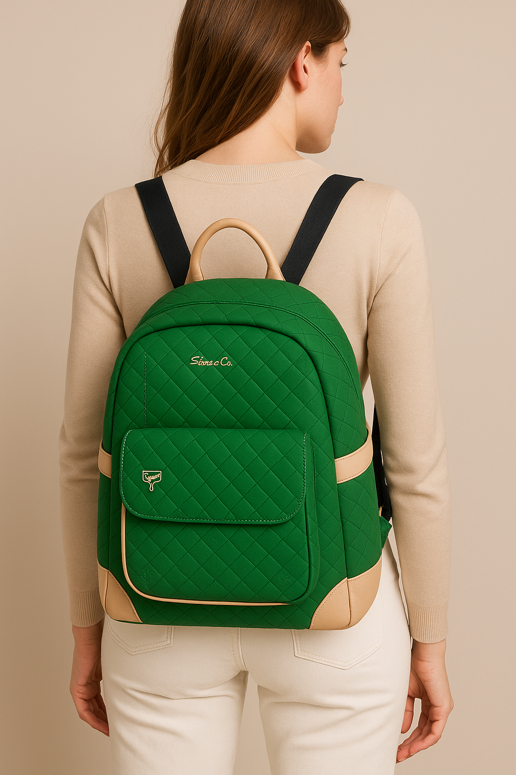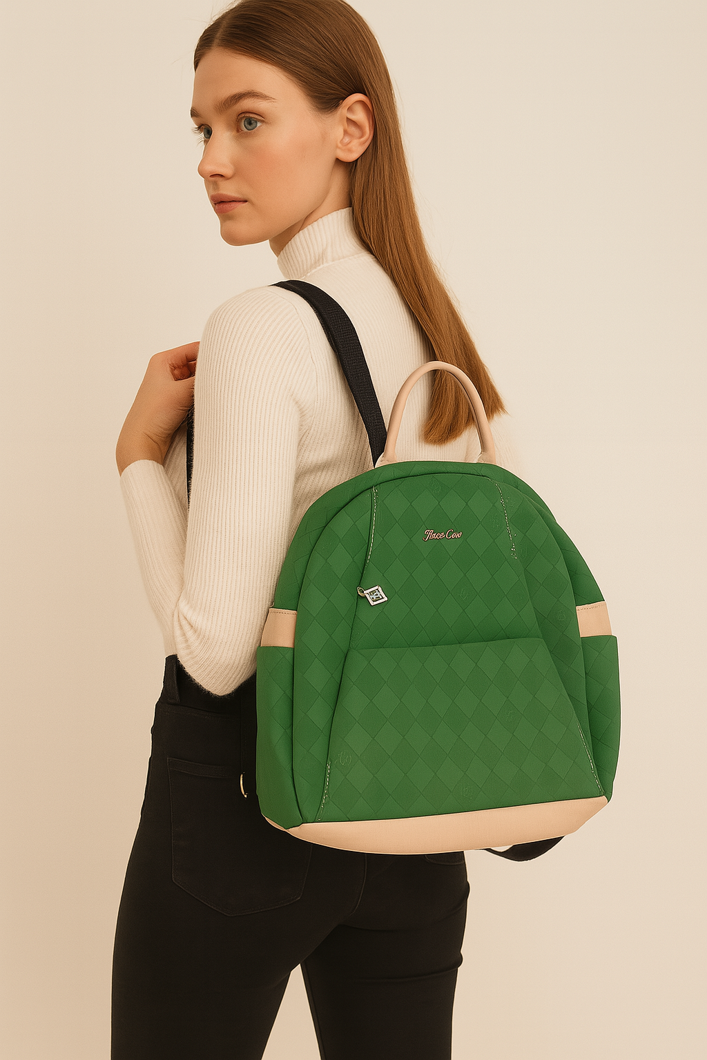 Canlı yeşil rengiyle dikkat çeken FullaCoco kapitone sırt çantası, hem tarz hem de konforu bir arada sunar. Ön yüzeyinde modern kare desenli kapitone doku ve markanın zarif logosu yer alırken, bej renkli kulp ve kenar detayları şıklığı tamamlar. Geniş iç hacmi, ön cebi ve ayarlanabilir askıları sayesinde günlük kullanım, okul ya da şehir içi geziler için idealdir. Hafif yapısı ve ergonomik tasarımıyla gün boyu rahat taşıma imkânı sağlar. Fonksiyonel ve estetik bir sırt çantası arayanlar için mükemmel bir seçimdir.