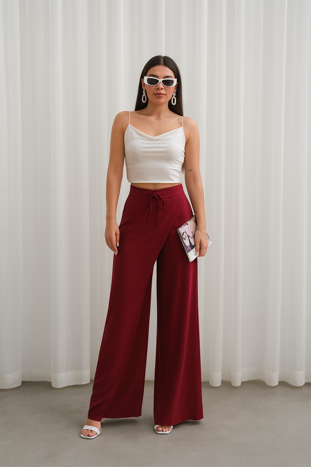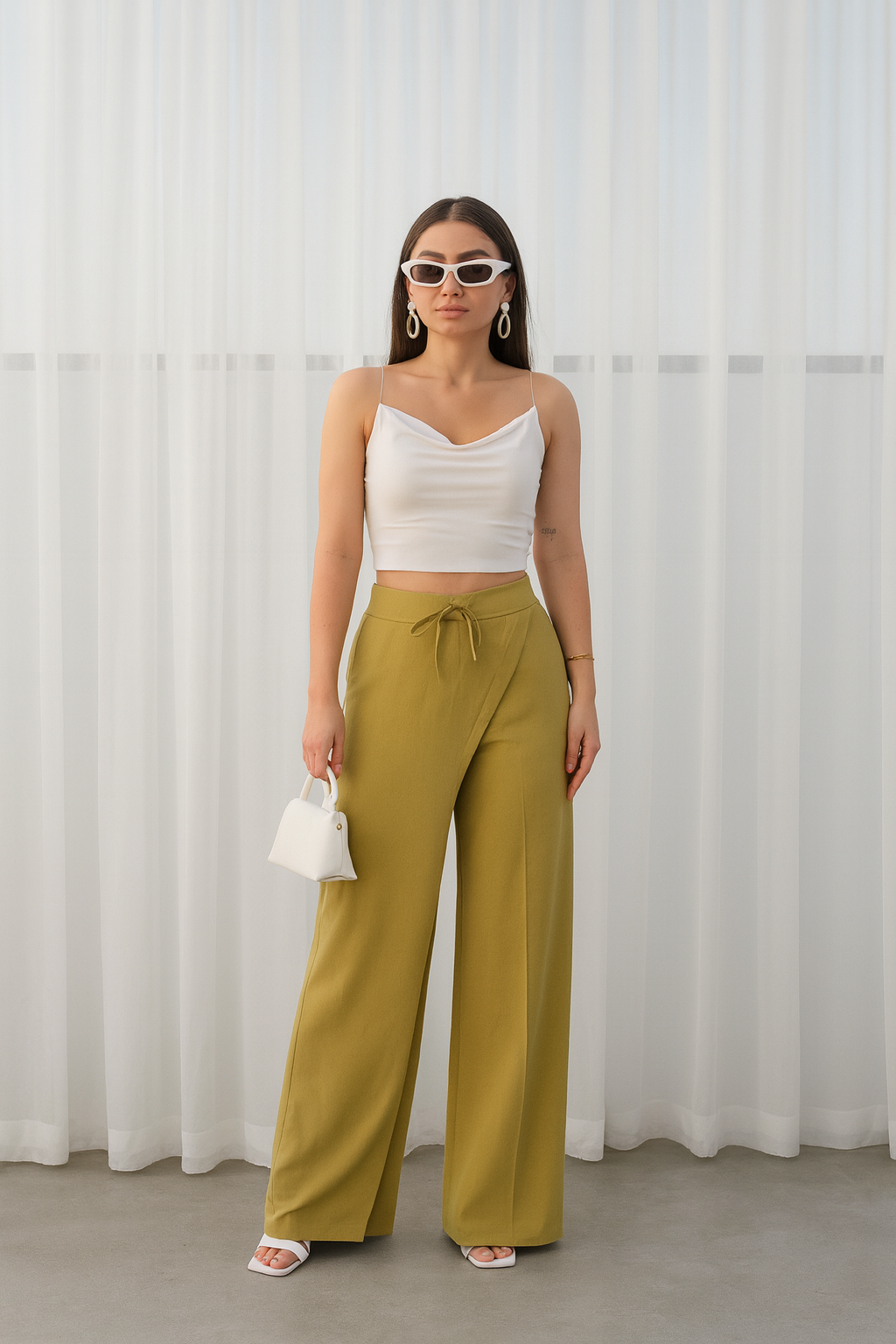 Yüksek bel formu bel hattını zarifçe vurgularken, beldeki bağlama detayı feminen bir dokunuş katar.