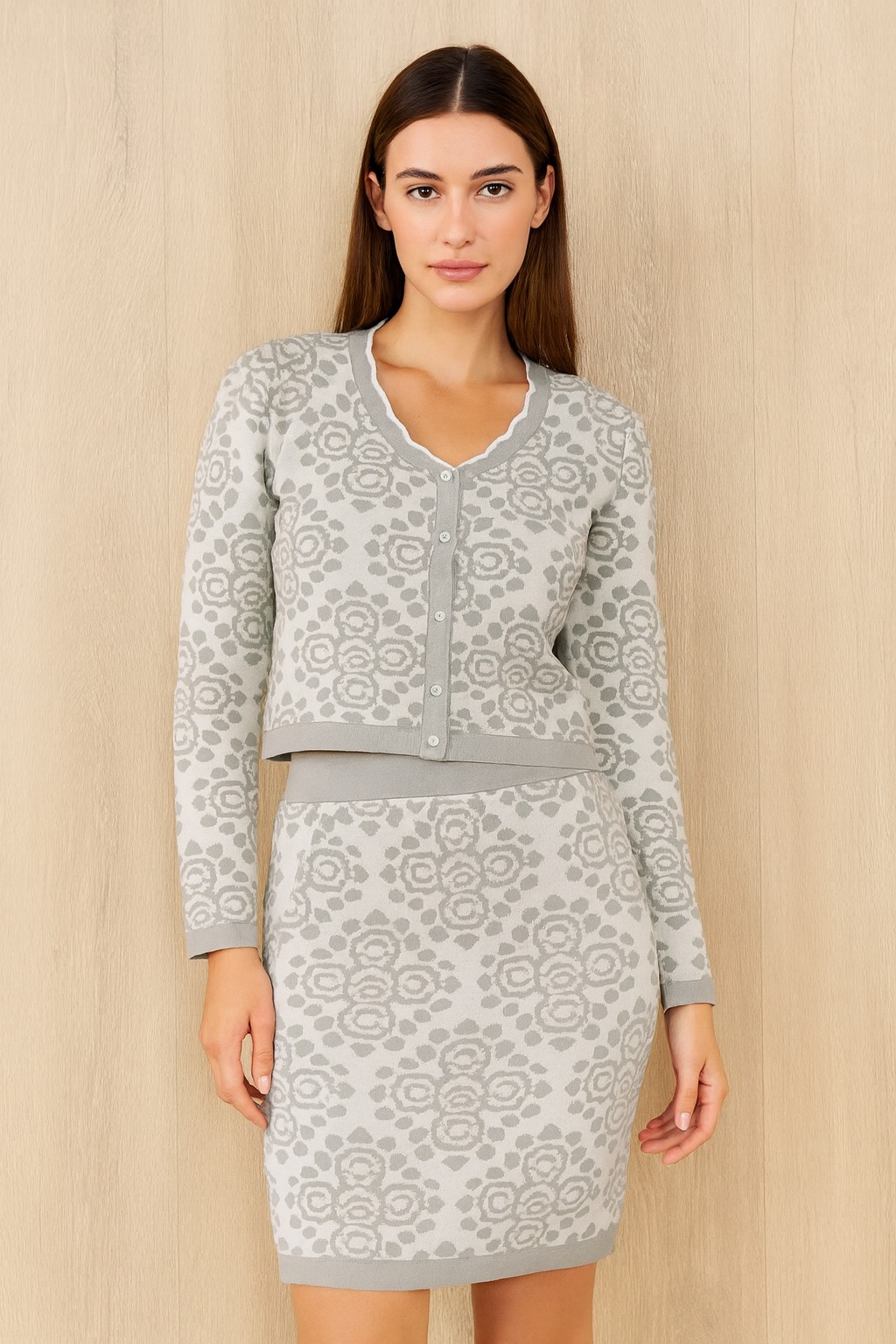 Şık ve modern tasarımıyla öne çıkan gri ikili takım, zarif desen detaylarıyla dikkat çekiyor. Yumuşak dokulu kumaşı sayesinde gün boyu rahat bir kullanım sunar. Uzun kollu, önden düğmeli kısa ceket ve yüksek bel etek kombinasyonu hem ofis şıklığı hem de günlük kullanım için uygundur.