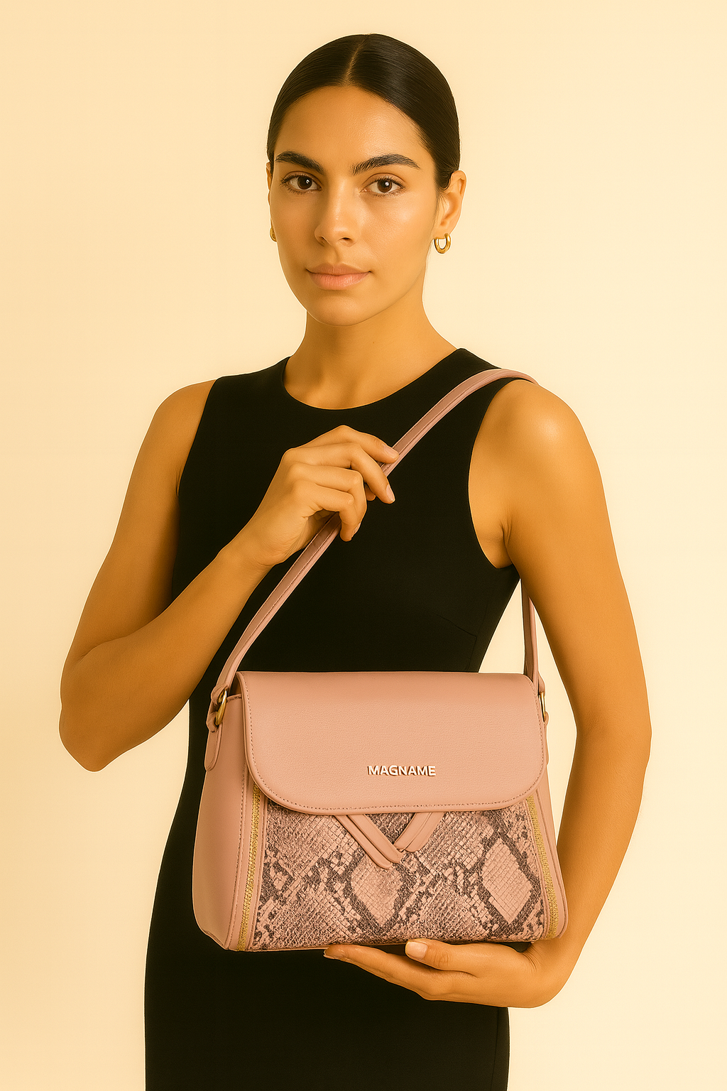 Zarif tasarımı ve doğadan ilham alan detaylarıyla dikkat çeken MAGNAME Rose Python Omuz Çantası, modern şehir kadınının şıklığını tamamlıyor. Pudra pembesi rengin yumuşak dokunuşuyla birleşen yılan derisi desenli yüzey, çantaya hem sofistike hem de cesur bir karakter kazandırıyor.