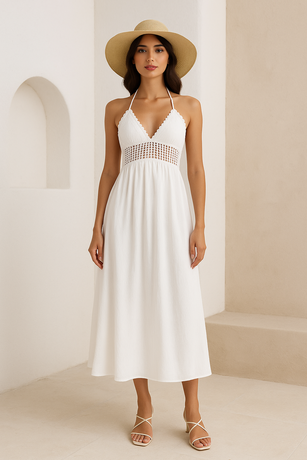 Santorini Breeze Dantel Elbise, beyazın saf zarafetini yazın en ferah haliyle buluşturuyor. Göğüs kısmındaki zarif dantel örgü detayı feminen bir dokunuş katarken, hafif kumaşıyla gün boyu konfor sunuyor. Midi boyuyla hem gündüz hem akşam kombinlerine uyum sağlar.