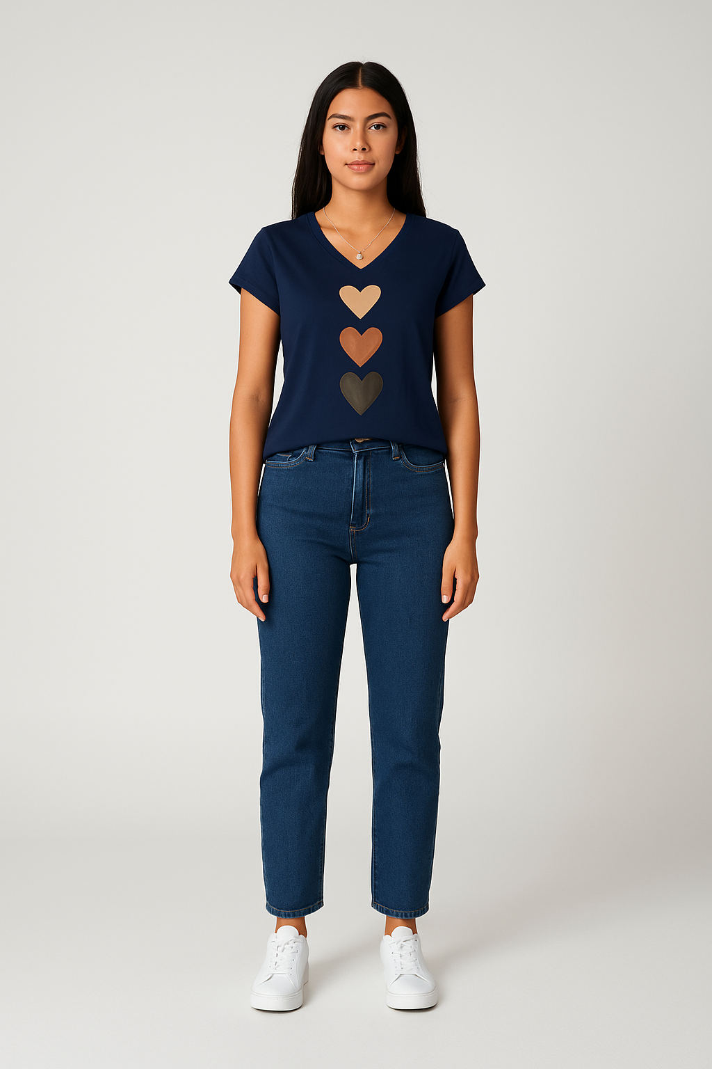 Trio Hearts V Yaka Tişört, lacivert tonun asaletiyle üç farklı renkte kalp detayını bir araya getiriyor. Yumuşak kumaşıyla konforlu bir kullanım sunarken, V yaka kesimiyle zarif bir görünüm sağlar.