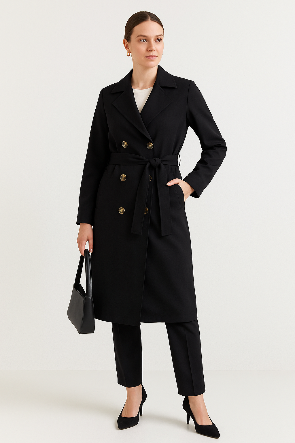 Urban Black Kuşaklı Trençkot, şehir hayatının temposuna uyum sağlayan modern bir duruş sunuyor.