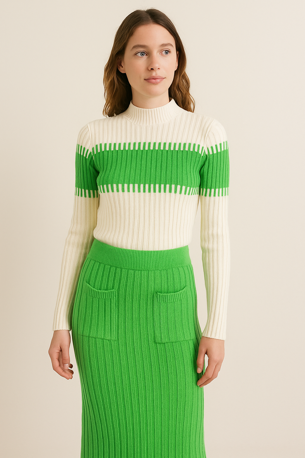 Aydesa Butik’in enerji dolu ve dikkat çekici bu iki parçalı triko takımı, hem şıklığı hem de konforu bir arada sunuyor. Üst parça boğazlı ve uzun kollu yapısıyla soğuk havalarda sıcak tutarken, yeşil enine şerit detaylarıyla sportif bir hava katıyor. Etek ise cepli tasarımı ve ribana dokusu ile hem rahat hem de stil sahibi bir görünüm sunar.